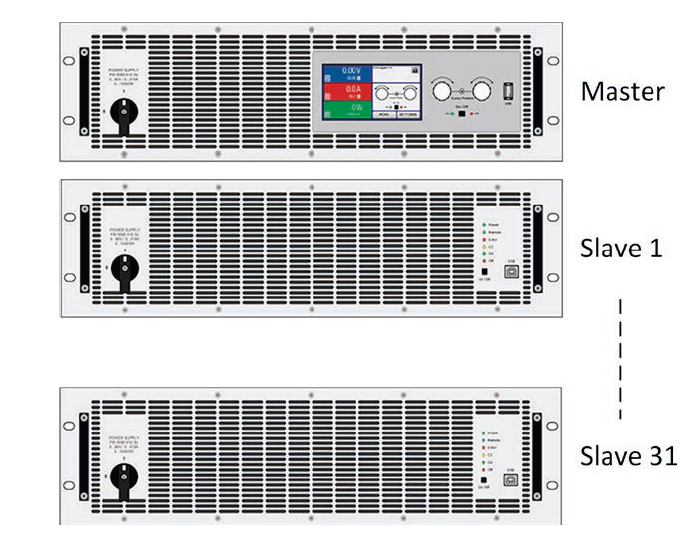 本系列15 kW型號的功率可以擴(kuò)展至480 kW,合并所謂的從機(jī)系列EA-PSI 9000 WR 3U Slave可以實(shí)現(xiàn)。它們需在主-從模式下運(yùn)行,并與本系列的一個型號作為主機(jī)并聯(lián)。一個該系統(tǒng)總共可以擴(kuò)展32臺機(jī)器。按需求,我們可以提供全部配置好即時使用的機(jī)柜,也可供多機(jī)柜系統(tǒng)。